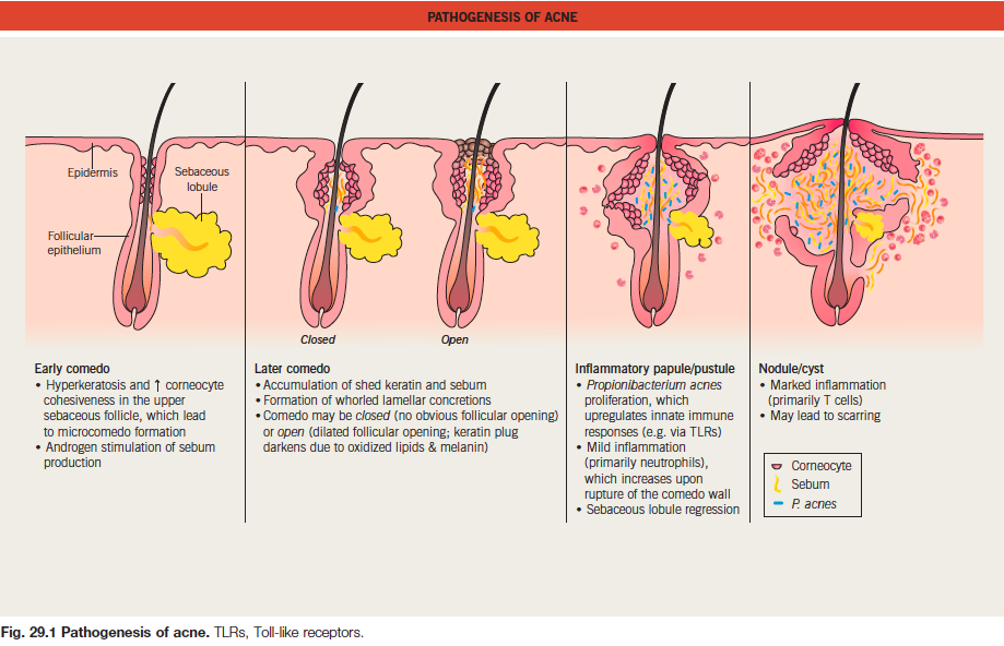 Il y a une kératinisation anormale des cellules du follicule avec un retard de desquamation et une cohésion accrue. Cela cause une formation de bouchon corné à la sortie du follicule pileux, ce qui crée des microcomédons, comédons ouverts et fermés (accumulation de cornéocytes)