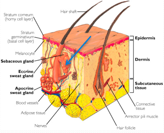 Dans l’acné, l’excès de sébum et l’accumulation de cornéocytes permettent la prolifération de P acnes. Il y a une production de lipases bactériennes qui transforment les TG du sébum en AG libres, qui induisent l’inflammation, la production de médiateurs pro-inflammatoires (IL-1, TNF-alpha)