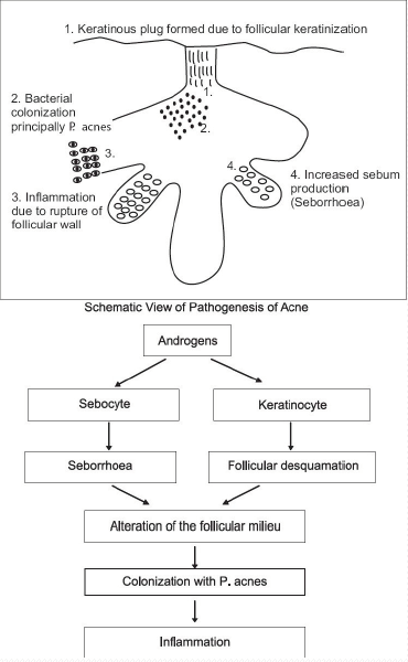 Il y a une augmentation des androgènes surrénaliens et gonadiques, ce qui cause une stimulation de la production de sébum. Il y a donc une hyperséborrhée (peau grasse). La stimulation hormonale est vraiment le facteur premier; si on n’a pas d’hormone, on n’a pas d’acnée.