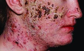 I: comedões (sebo+queratina). II: inflamação dos comedões. III: processo inflamatório mais profundo, promovendo o aparecimento de cicatrizes (destruição completa dos folículos). IV: forma grave de acne, sendo formada pela união das lesões (abcessos) e formação de fístulas, sendo frequente a formação de cicatrizes. V: aparecimento de sintomas sistêmicos (fadiga, febre, MEG, mialgia, artralgia), acometendo essencialmente homens, sendo uma lesão com necrose e desencadeada pelo uso da isotretinoína.