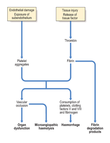 Centres on the enhanced generation of thrombin. Factors contributing to the process include increased TF expression, suboptimal function of natural anticoagulants and dysregulation of fibrinolysis. This dysregulated activity results in the production of plasmin, which causes digestion of fibrin and fibrinogen-generating split products (fibrinogen and fibrin degradation products; FDP), which themselves have an anticoagulant and anti-platelet effect and contribute to the haemorrhagic diathesis.
