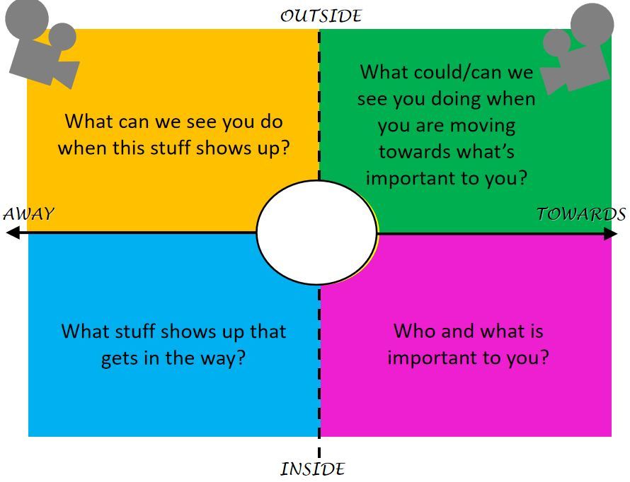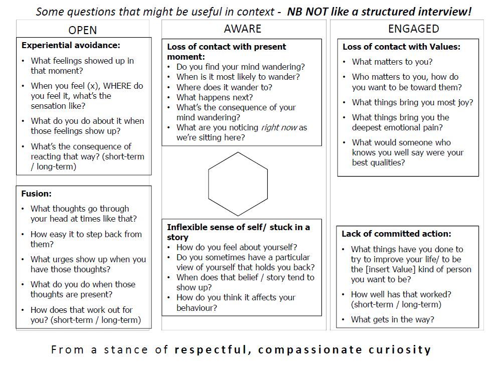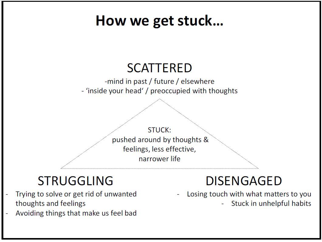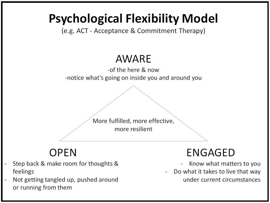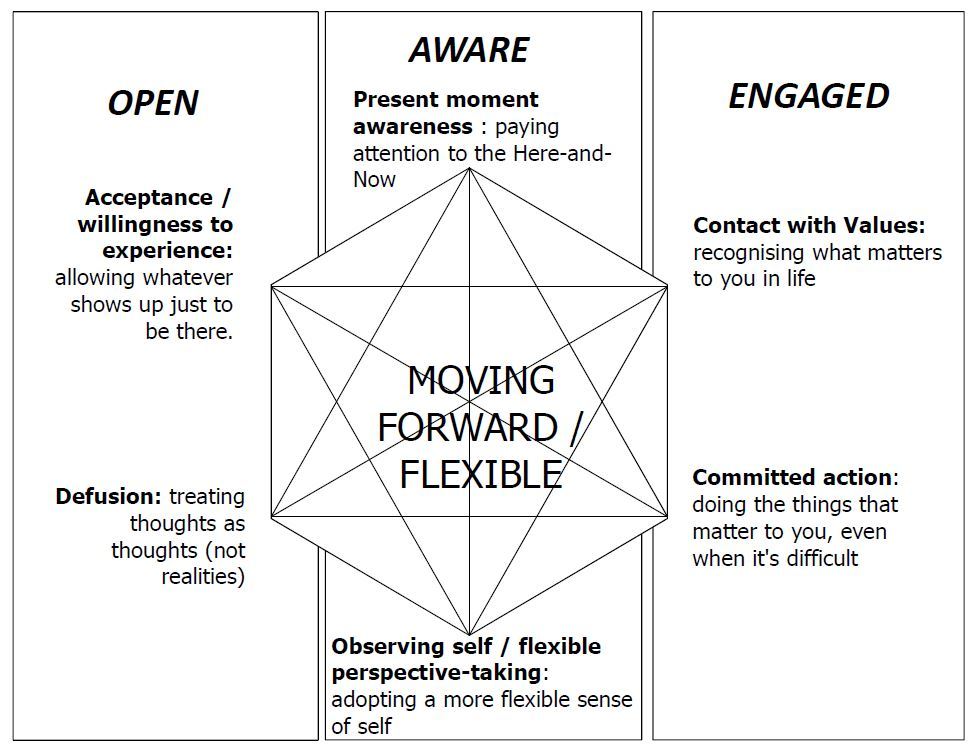 acceptance of internal experience, comittment to moving towards values, Therapy (not always)