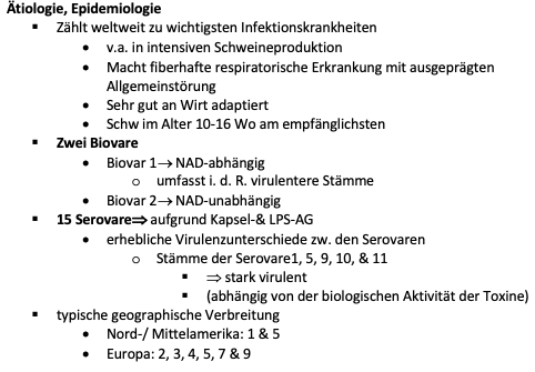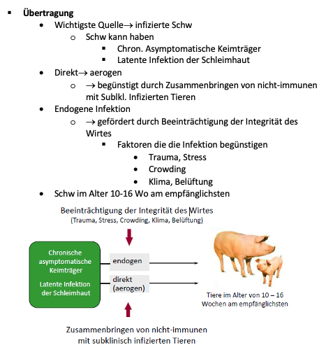 Der fakultativ pathogene Keim wird direkt aerogen übertragen. Das natürliche Habitat sind Nasopharynx und Schleimhaut des Genitaltrakts von Schweinen. Er besitzt eine recht hohe Wirtsspezifität, und wichtige Übertragungsquelle sind chronisch asymptomatische Keimträger, bei denen es zu einer endogenen Infektion kommen kann, sowie Tiere mit latenten Schleimhautinfektionen, die den Keim aerogen übertragen. Der Erreger ist weltweit verbreitet, und die Pleuropneumonie beim Schwein zählt zu den wichtigsten Infektionskrankheiten in der intensiven Schweineproduktion. Stressoren wie schlechtes Klima, Stress und v. a. Crowding von latent infizierten und immun-inkompetenten Tieren begünstigen die Erkrankung (Faktorenkrankheit).