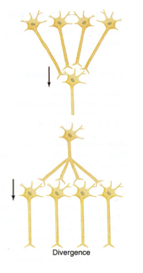 Divergence = one impulse in, multiple neuron branches out (motor neuron to a group of muscles)