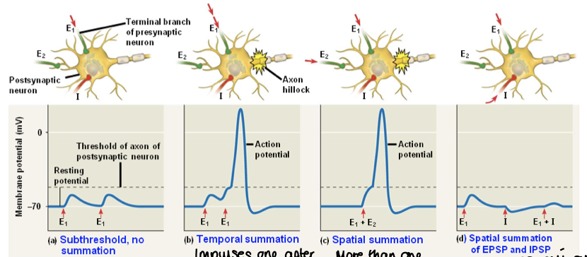C) Spatial summation = more than one EPSP impuluse simultaneously on the same neuron - strong enough to meet threshold