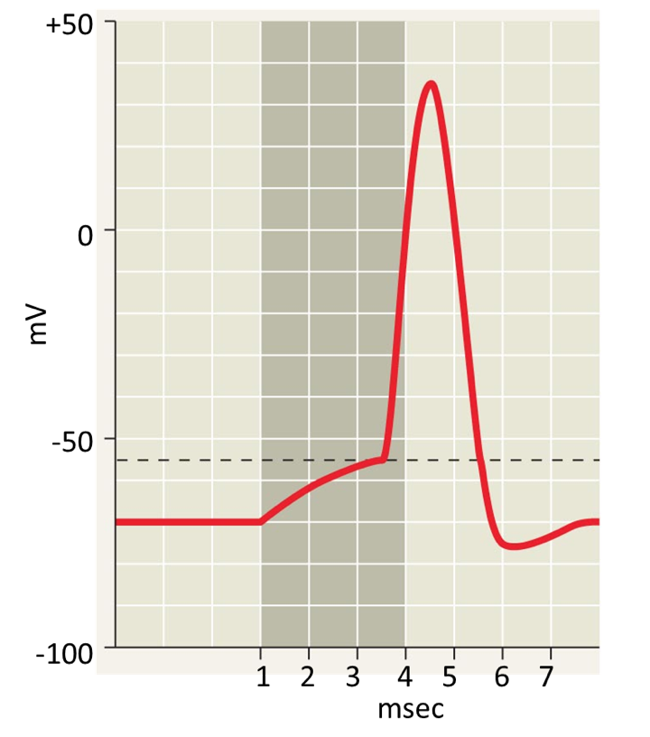 a change in the membrane potential from the value at rest to a less negative value, excitatory