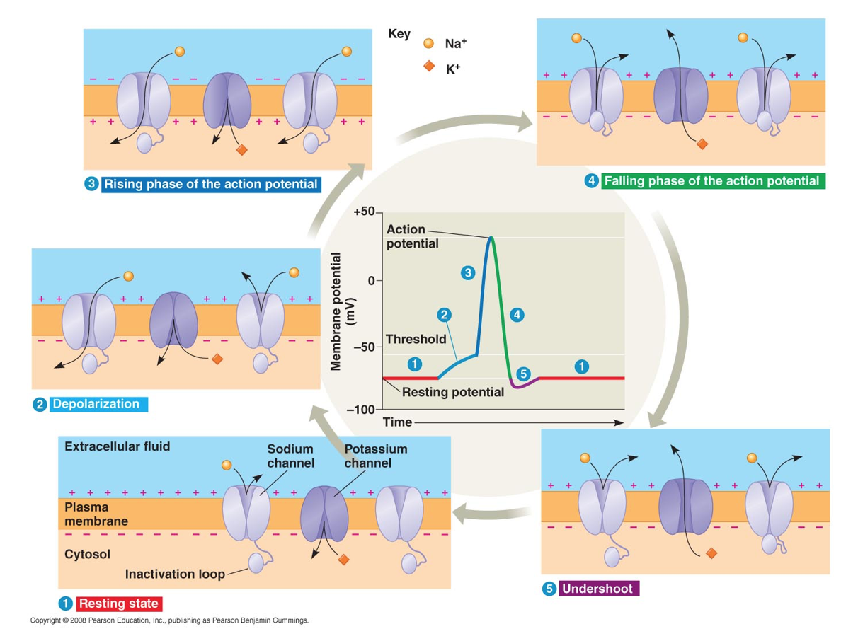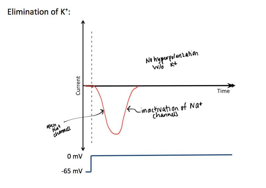 Na opens quickly, inactivates quickly through ball and chain, deinactivates with slight delay at resting membrane potential; K opens with a delay, does not have inactivation, and closes with a slight delay at resting membrane potential