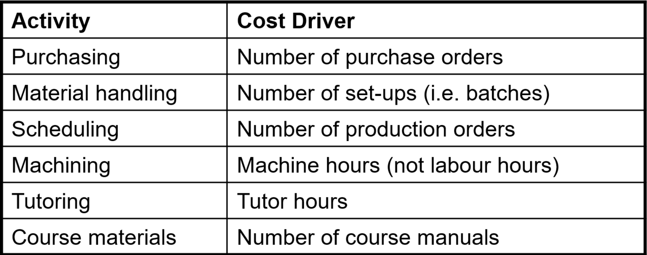 Examples of activities and relevant cost drivers (6)