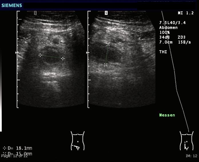 Ultrasound examination may show evidence of lumenal obstruction and thickening of the appendiceal wall as shown below