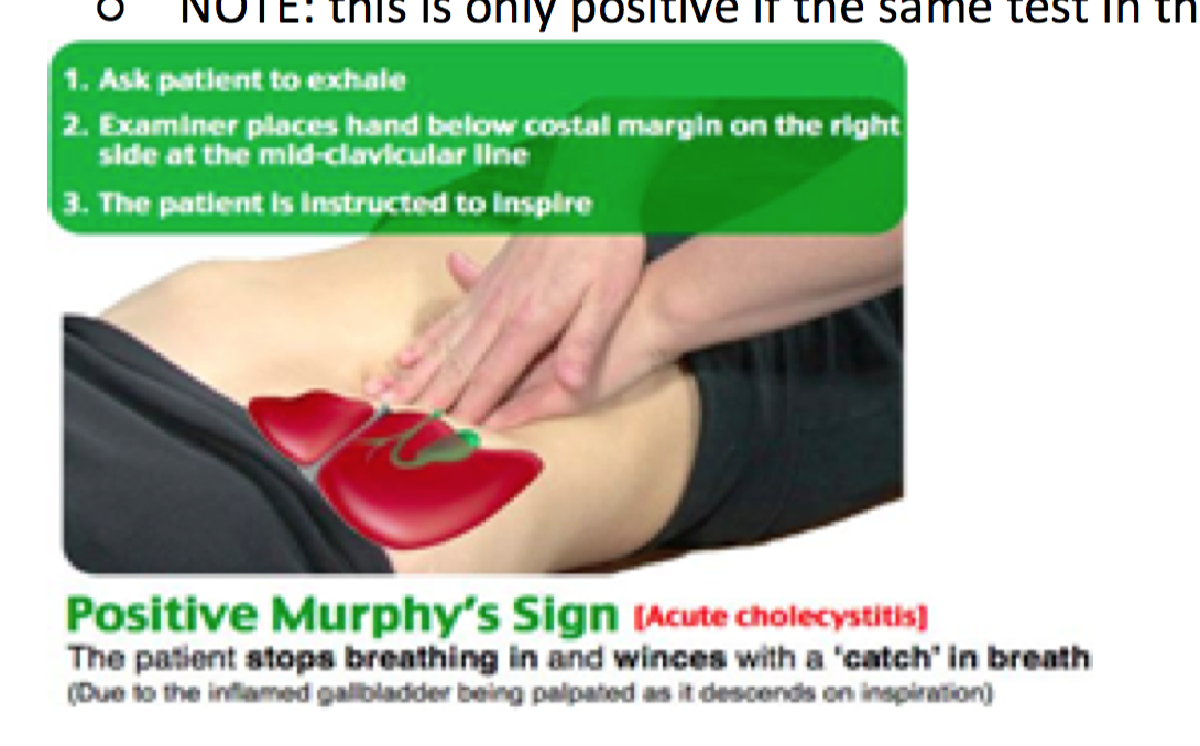 Prolonged upper abdominal pain that may be referred to the right shoulder (due to diaphragmatic irritation) - this is exacerbated by movement and resp