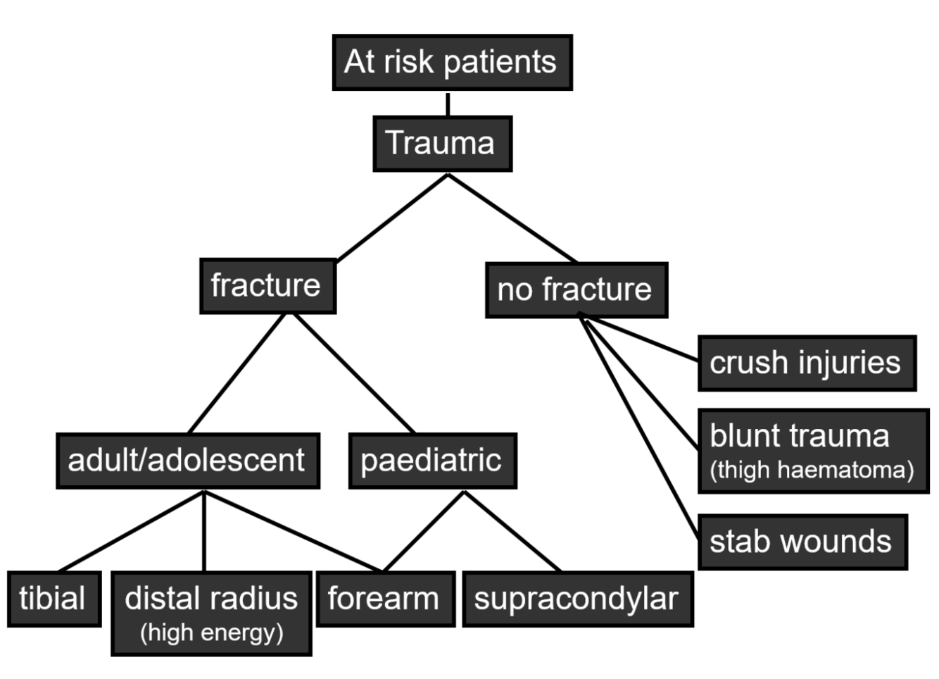 what are the at risk sites for compartment syndrome? high to low risk order