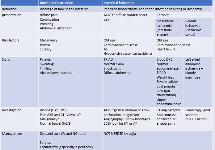 IF Ileus (lower bowel motility - functional obstruction)- absent bowel sounds, less pain