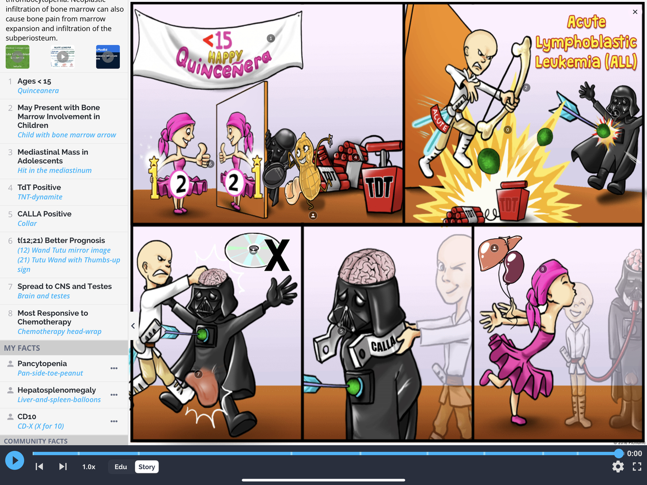 Meningeal leukemia manifests as ______- type presentation; Mediastinal manifests as ______- type presentation.