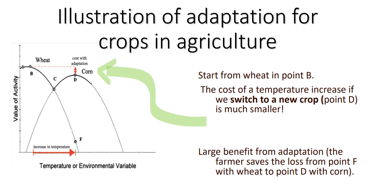 Illustrate graphically using Nordhaus two-crop example, the benefits of adaptation in agriculture in the face of an increasing temperature