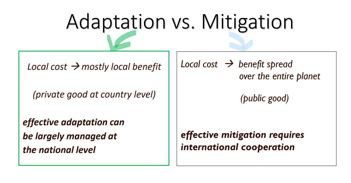 Adaptation is the act of reducing the impacts of climate change through “defensive” policies: modifying the way society and politics work in order to not experience as big consequences