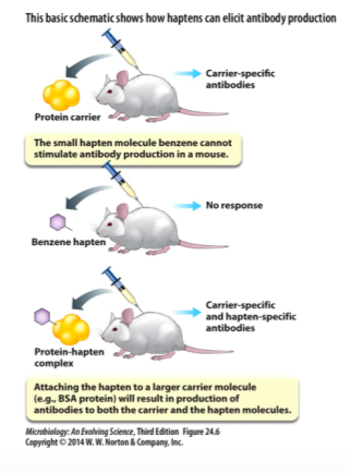 Hapten = small molecule that are not immuniogenic on their own, much be convalently attached to a large carrier protein or other molecules