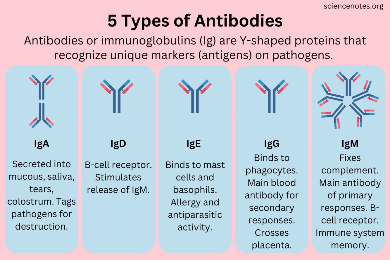 Name the 5 different immunoglobulins produced by B cells?