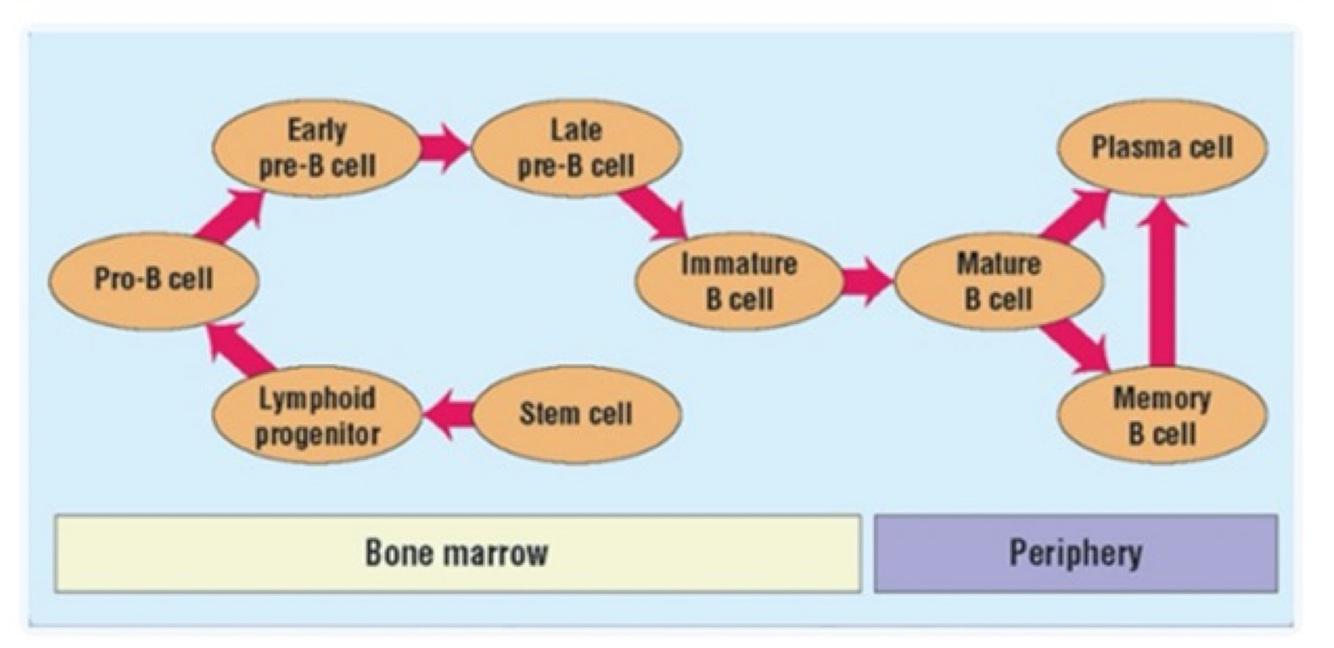 Summarise the development process of B cells?
