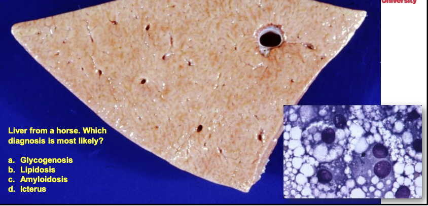 vacuoles in the cytoplasm and this is typical of hepatic lipidosis. The special stain we use for lipid is Oil Red O.