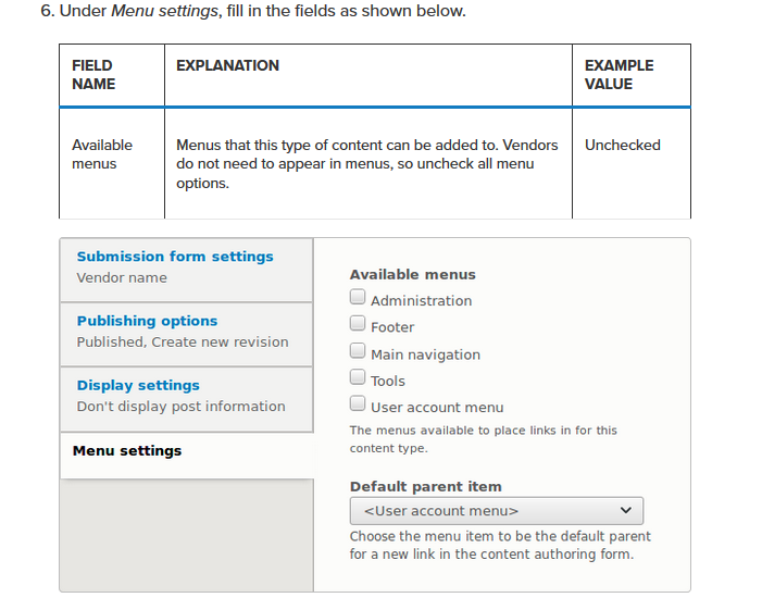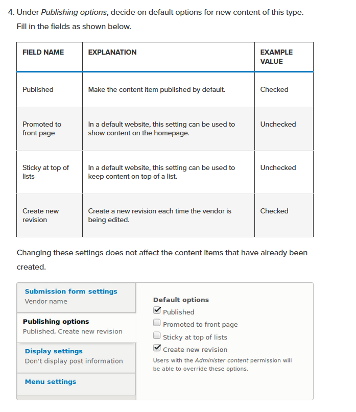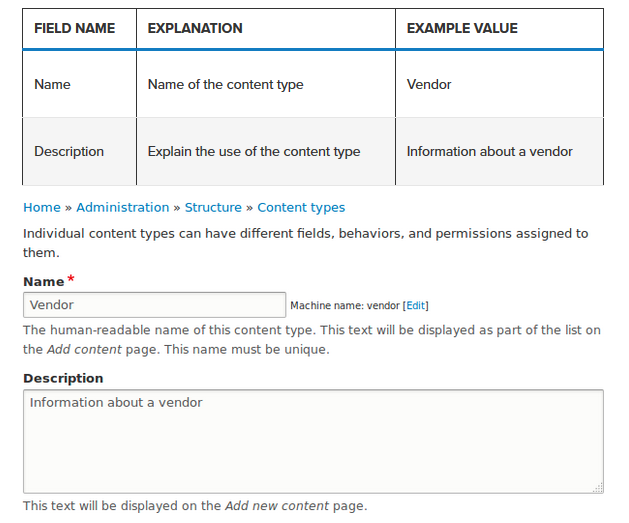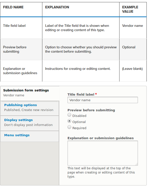 Explanation or submission guidelines – Instructions for creating or editing content. (This text will be displayed at the top of the page, when creating or editing content of this type).