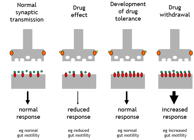 4 - After stopping taking the drug, the increased sensitivity produced by step 3 together with the return to normal neurotransmitter production results in withdrawal symptoms