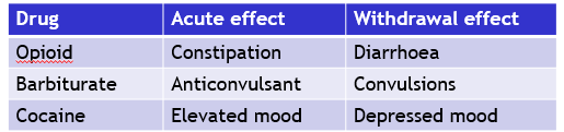 Give examples of addictive drugs, their acute desired effects and the associated withdrawal effects to illustrate withdrawal phenomena?