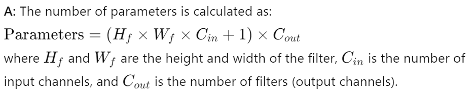 The parameters in a convolutional layer are the weights of the filters (kernels) and the biases. Each filter has weights corresponding to its size and the number of input channels, plus a single bias term.