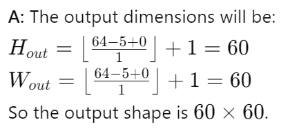 Calculate the output dimensions for an input of size 64x64 with 3 channels, using a filter of size 5x5, stride 1, and valid padding.