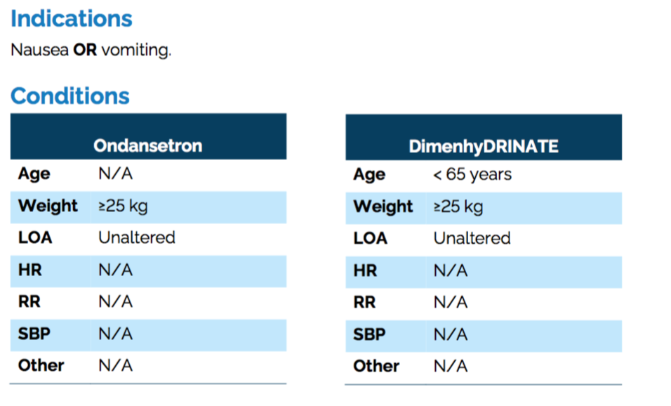 * Ondansetron: weight ≥25 kg, unaltered LOA (bc may cause further drowsiness)