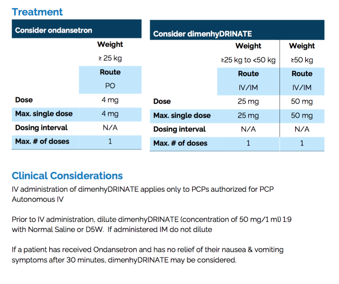 Treatment: Consider ondansetron; Consider dimenhydrinate (seen screenshot)