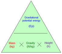 Gravitational potential energy (Ep) = mass (kg) x gravity (N/kg) x height (m)