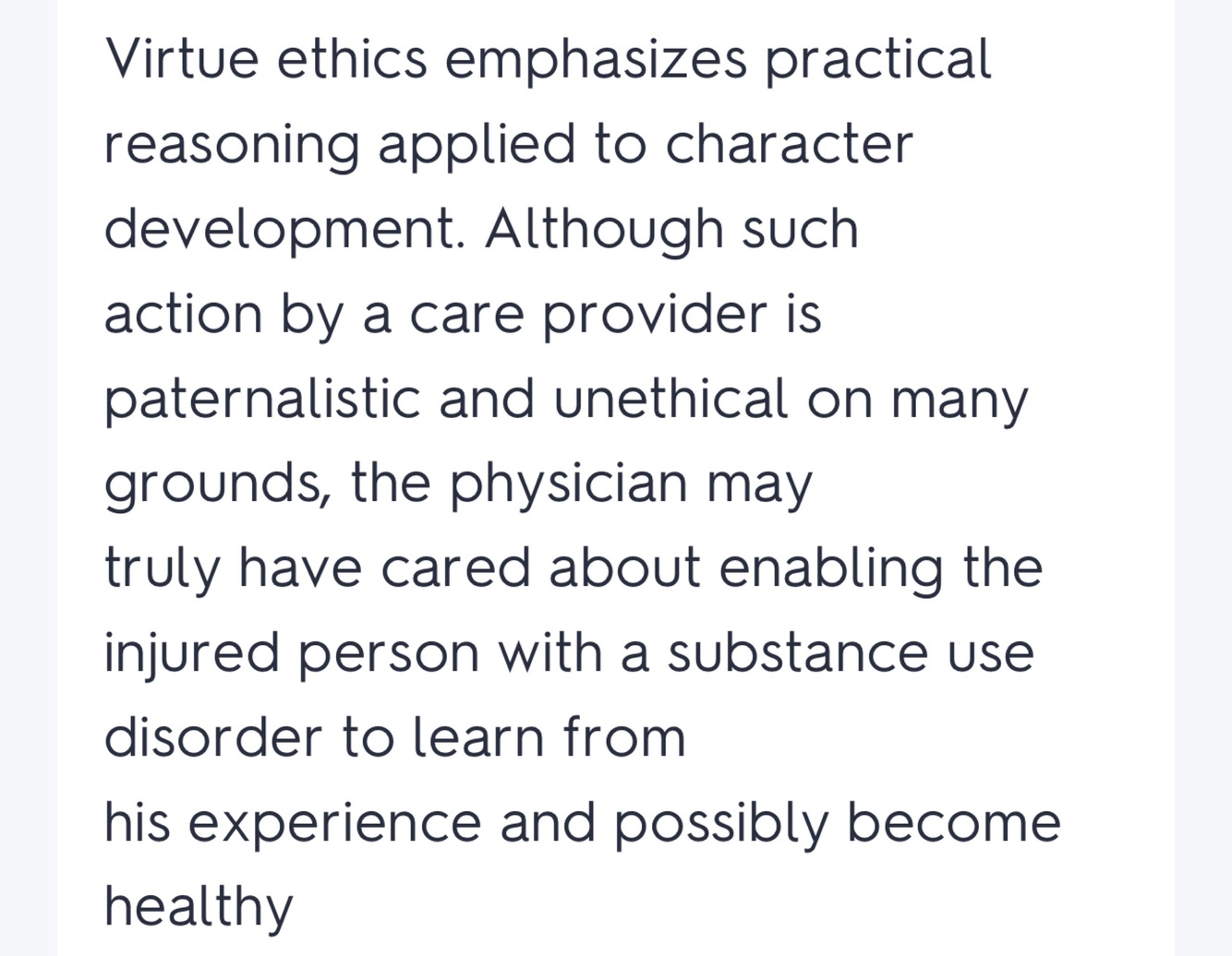 A physician refuses to order pain medication for a person with substance use disorder who was severely injured in a car accident. When the community health nurse requests medication to be used prn, the physician states that the client’s suffering from the pain of his injuries will build character. What ethical theory is the physician using (or misusing)?