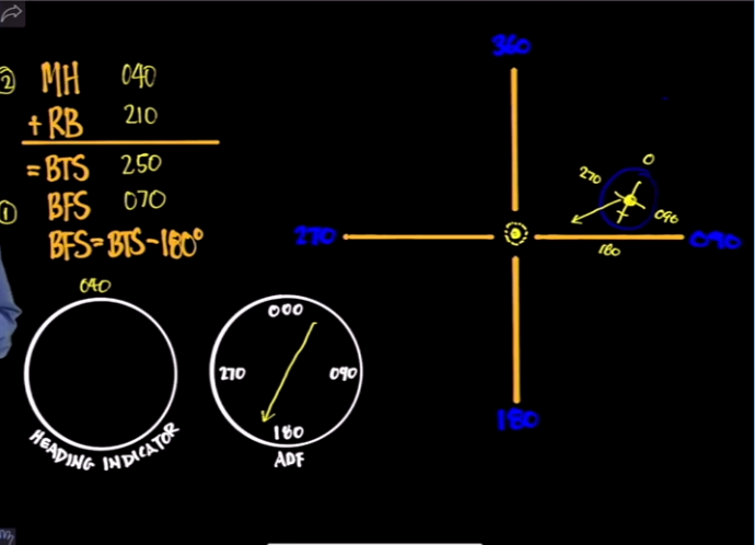 If the aircraft is flying 040° and the ADF is showing a relative bearing of 210°, then the heading to fly to the station is 250°