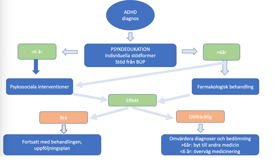Metylfenidat - förstahandsval. Finns olika varianter med olika farmakokinetisk profil, exempelvis Concerta som är långverkande eller Ritalin som finns både som kortverkande och långverkande. Verkar genom icke-kompetitiv DAT- och NET-antagonism, alltså återupptagshämmare av presynaptiska dopamin- och noradrenalintransportörer.