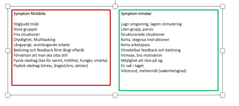 Hyperaktiv – svårt att sitta stilla, lämnar klassrummet, rastlös och sömn.