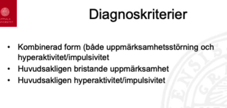 För diagnos ADHD ska man minst a 6 av 9 symtom på ouppmärksamhet och/eller minst 6 av 9 symtom på hyperaktivitet och impulsivitet.