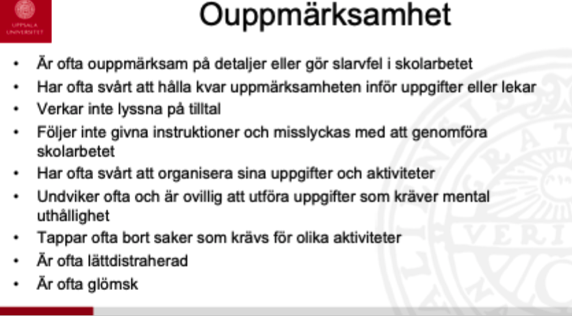 Nämn exempel på symtom på ouppmärksamhet