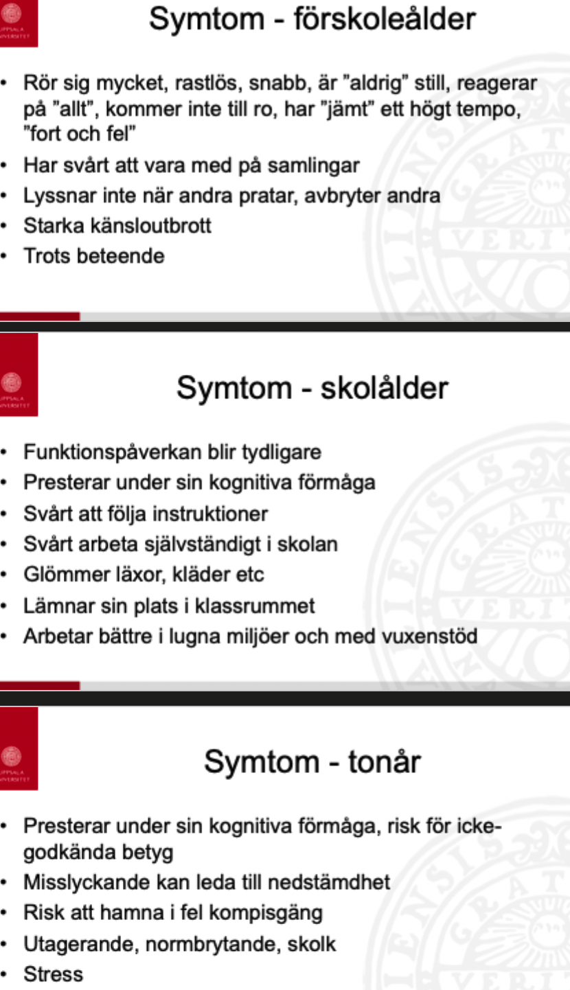Nämn exempel på symtom på ADHD under förskoleålder, skolålder och tonår