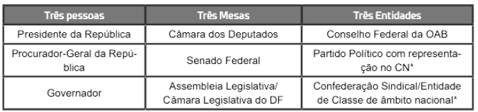 II – Mesa da Câmara dos Deputados; III – Mesa do Senado Federal; IV – Mesa da Assembleia Legislativa dos Estados ou Mesa da Câmara Legislativa do DF;