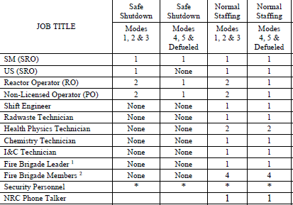 Crew composition may be one less than the minimum requirements for a period of time not to exceed two hours in order to accomadate unexpected absence of on-duty shift crew members, provided immediate action is taken to restore shift crew ocmposition to within minimum requirements.