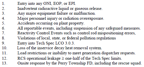 List situatons requiring verbal notificaiton by the SM to the Ops Section Manager or Duty Team