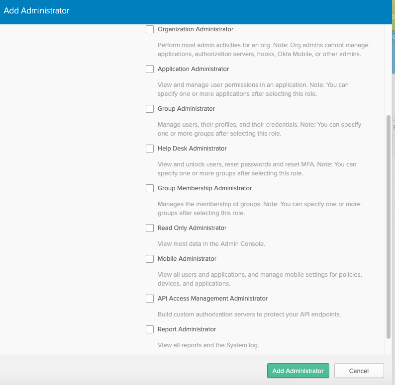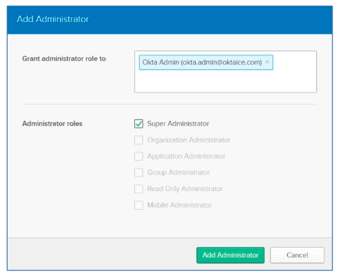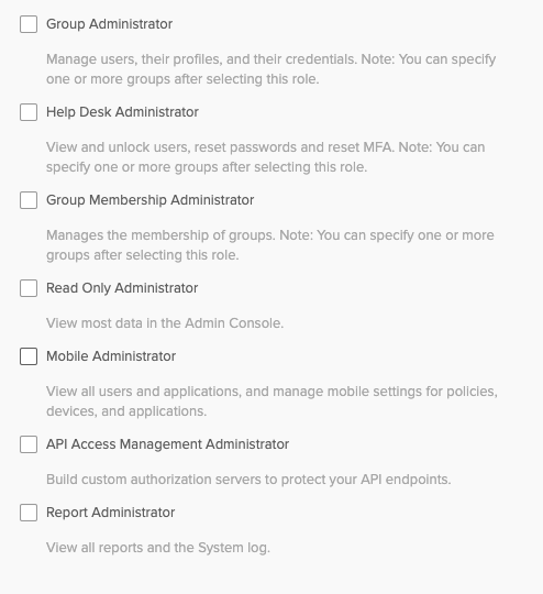 Note: Org admins cannot manage app, authorization servers, hooks, Okta mobile or other admins.
