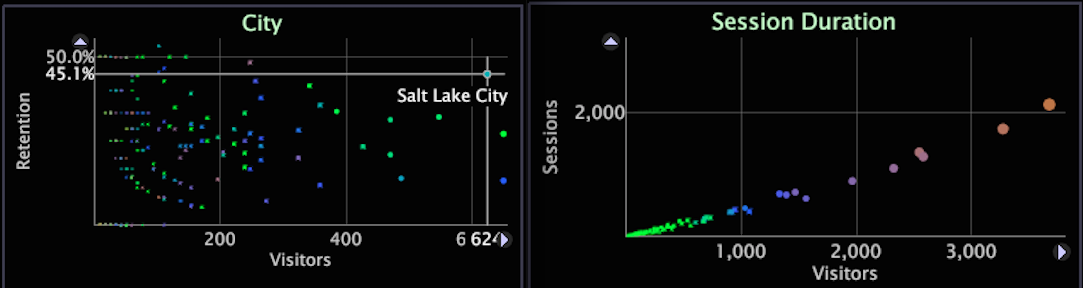 Scatter plots can be useful when trying to understand the relationship between large numbers of disparate items, by two different metrics. In the following example, the scatter plot is showing each city by the number of visitors and the respective retention rate.