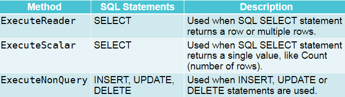 ExecuteReader, ExecuteScalar, ExecuteNonQuery