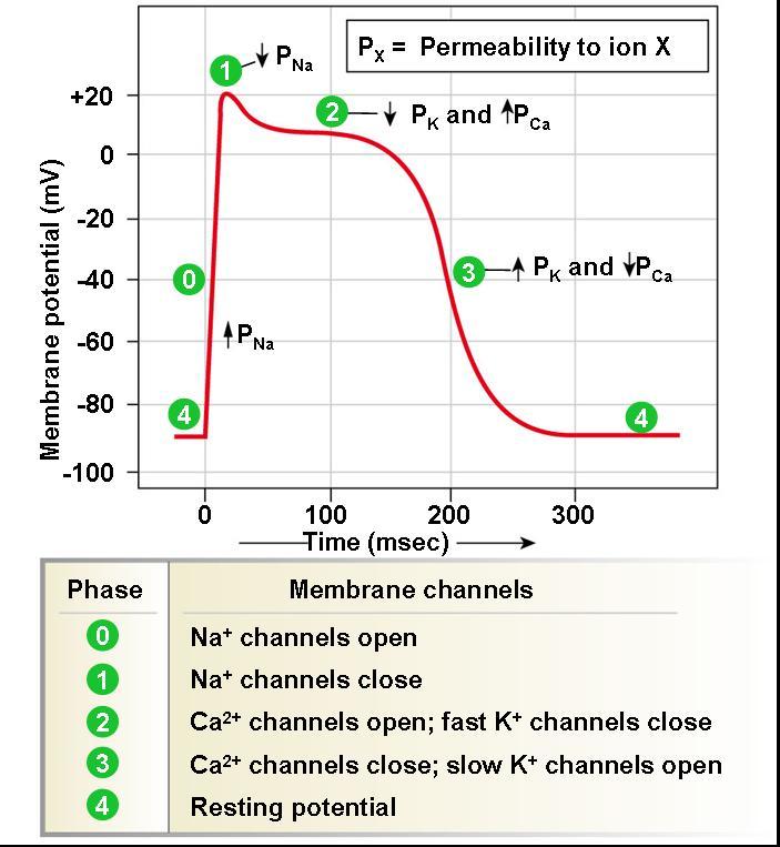 Phase 0 - Rapid depolarisation (influx of Na+) Phase 1 - Partial repolarisation (deactivation of Na+ influx and eflux of K+) Phase 2 - Plateau (slow influx of Ca2+, equals the efflux of K+) Phase 3 - Repolarisation (deactivation of Ca2+ influx, K+ eflux) Phase 4 - Pacemaker potential (slow influx of Na+ which slows the eflux of K+, “autorhythmicity”) Refractory period - Phases 1-3