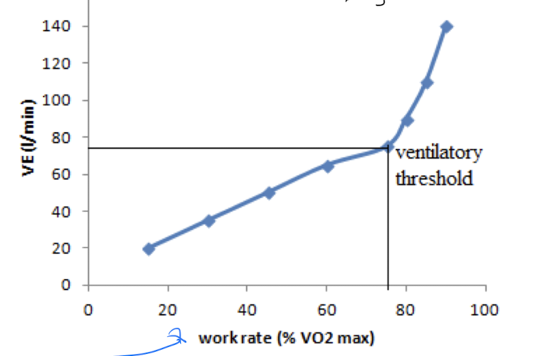 - the more dependent you start using thr anaerobic system, the more rapid the breathing (AKA ventilatory threshold) = hard to carry a conversation