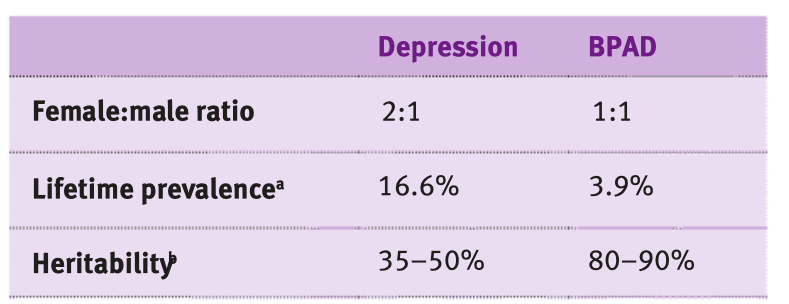 Describe the epidemiology of depression and BPAD?1