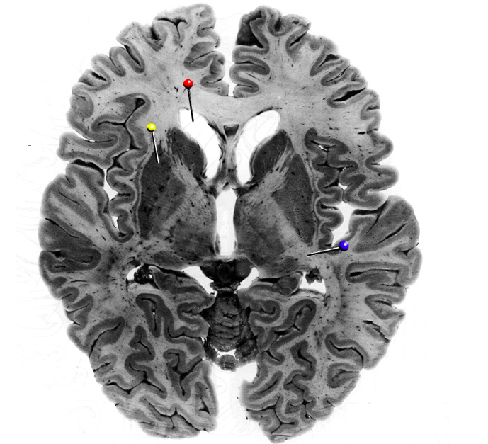 In the horizontal brain slice, the yellow pin is in the…