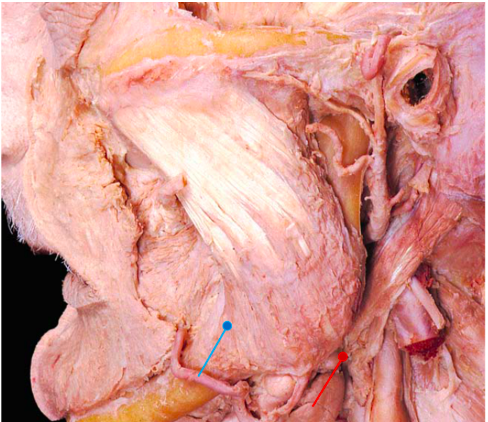 The picture shows a dissection of the mandibular region. Identify the corner of the mouth to orientate yourself.