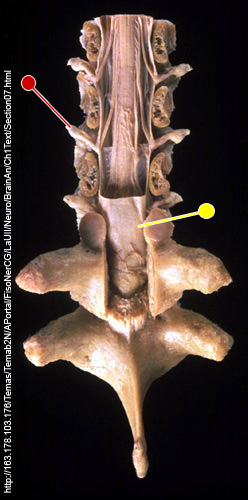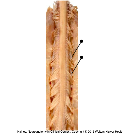 The structures indicated by the black pins support the spinal cord within the vertebral canal; identify them.